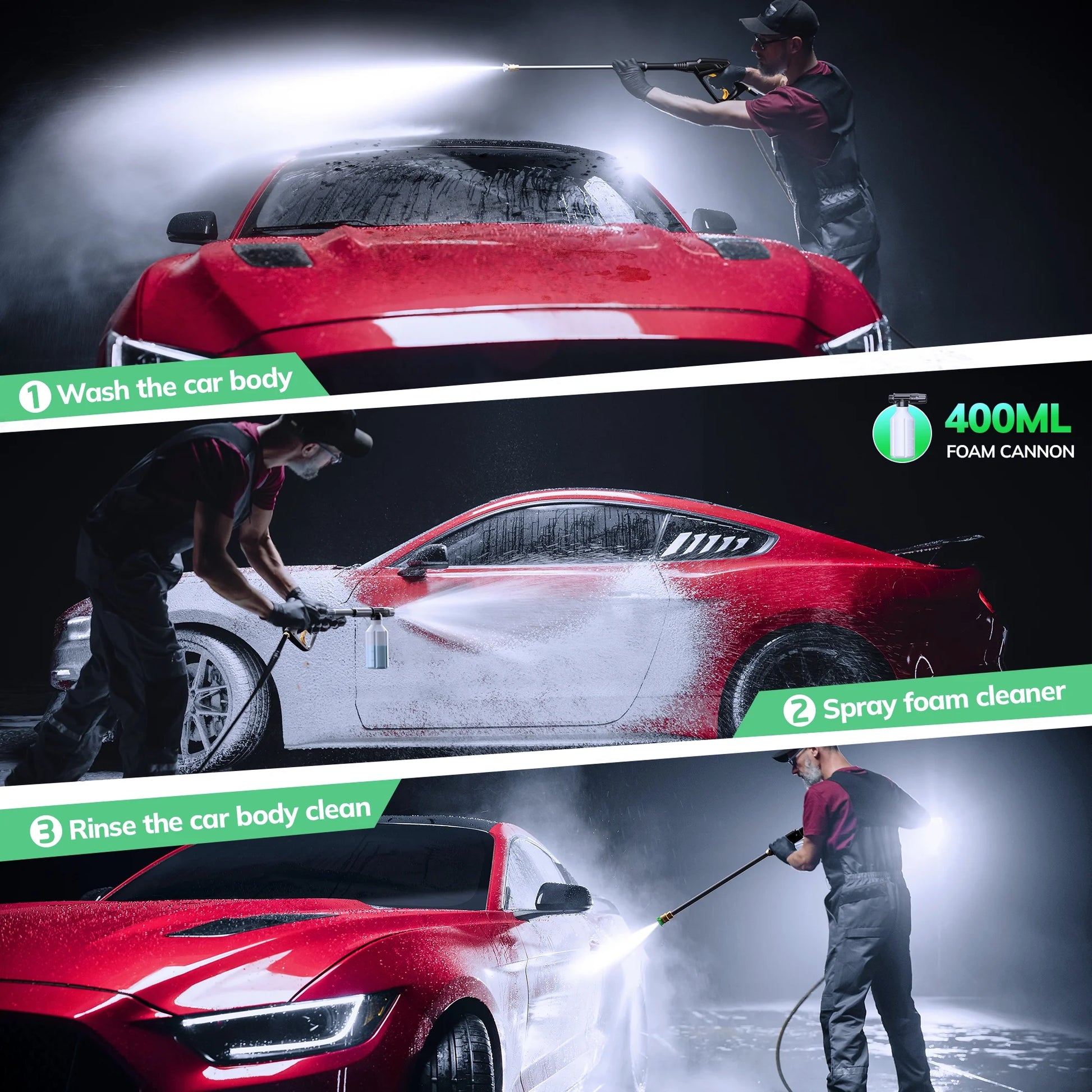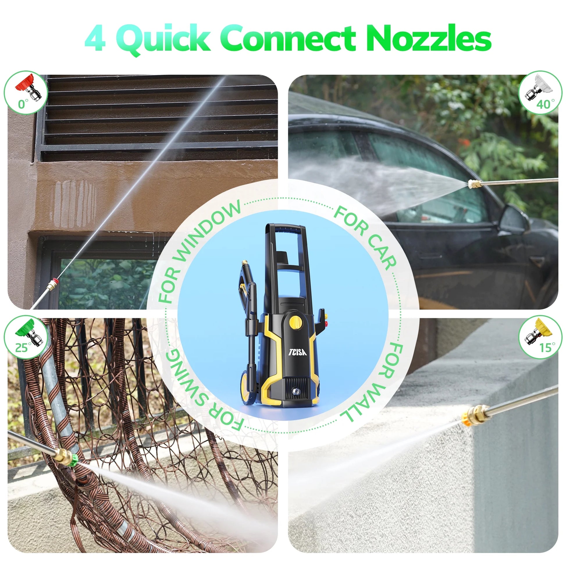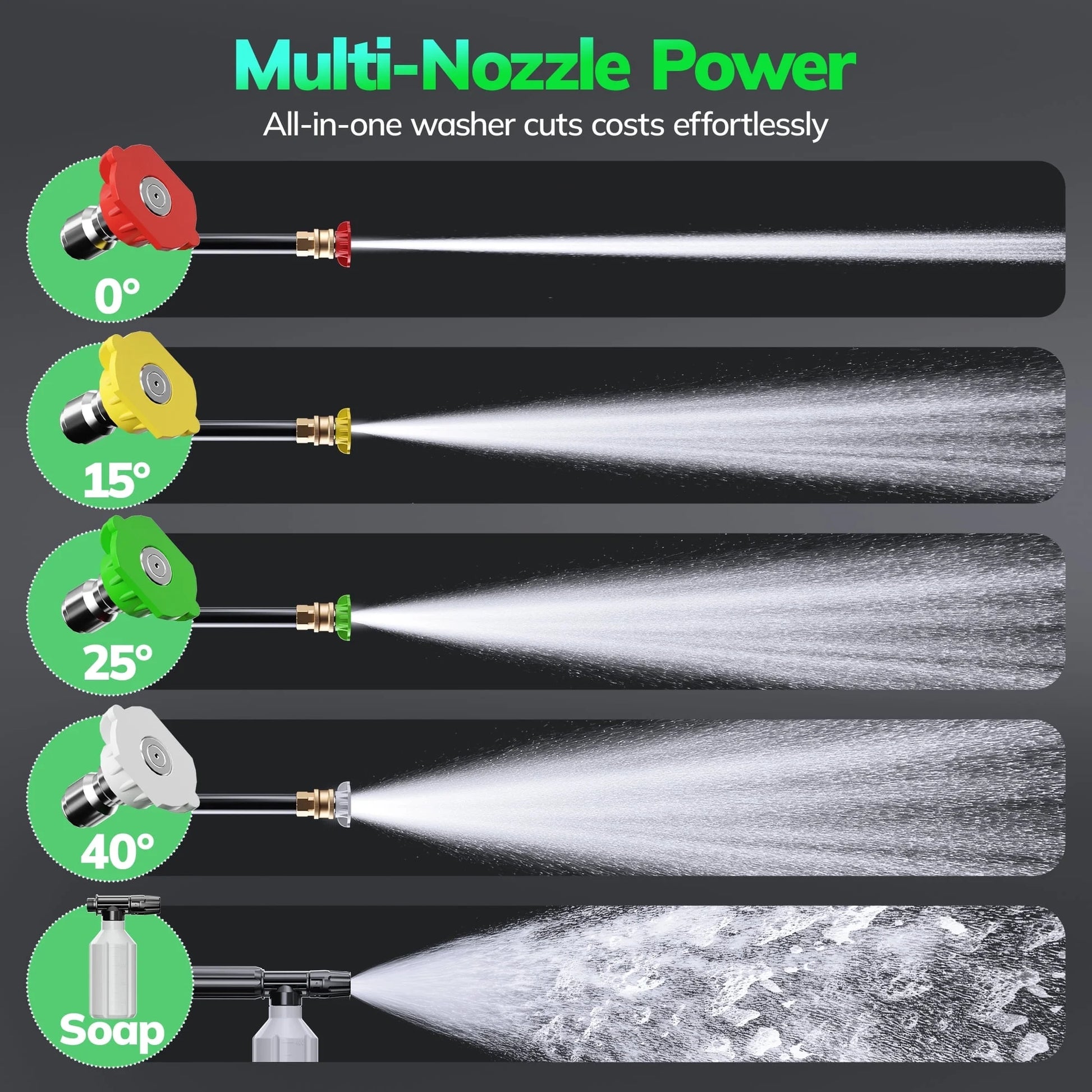 【Versatile Nozzles & Soap Cannon】: Say goodbye to one-size-fits-all cleaning! Our electric power washer features 4 different quick-connect nozzles and a Soap cannon, ensuring maximum cleaning efficiency in any situation. From gentle to tough, we've got you covered!