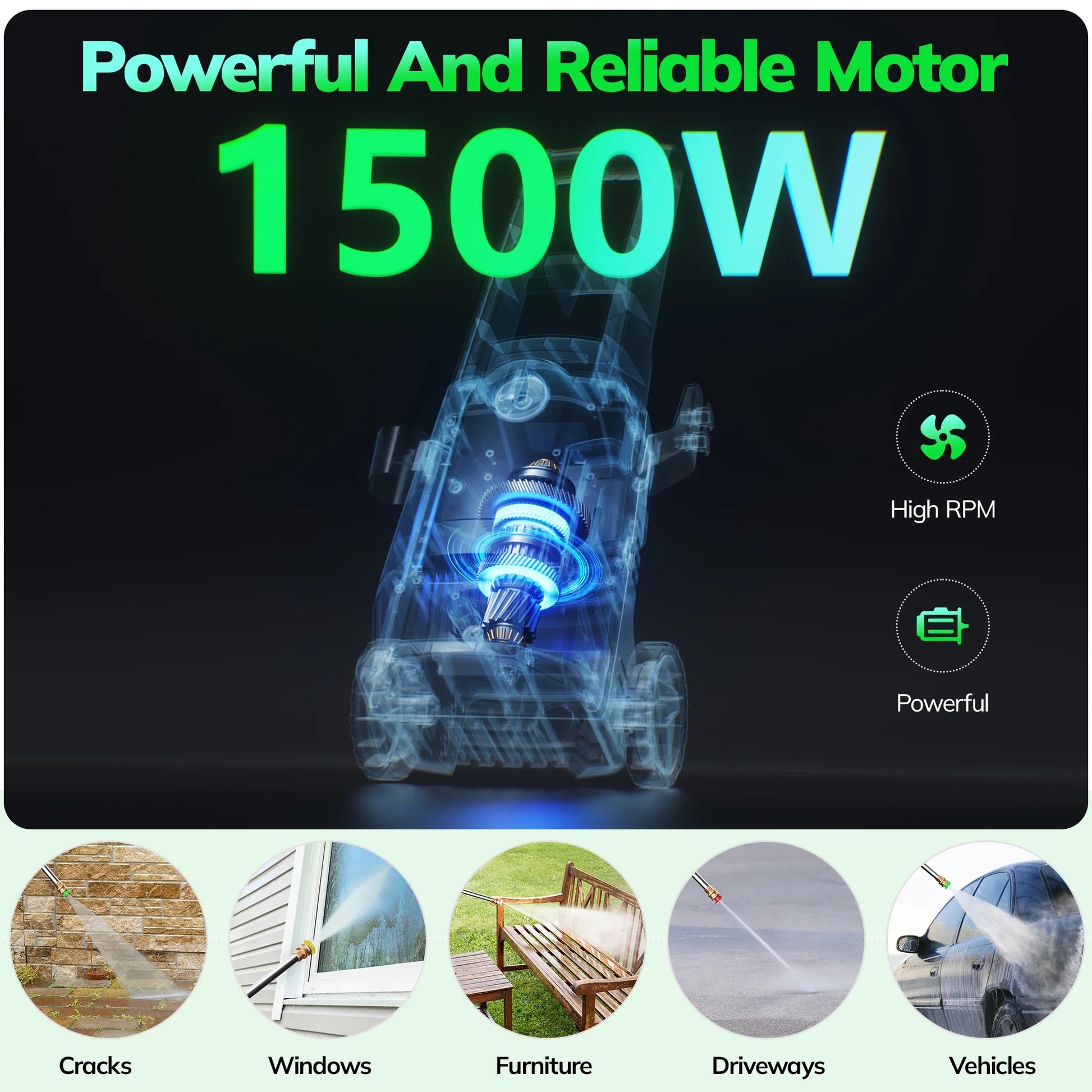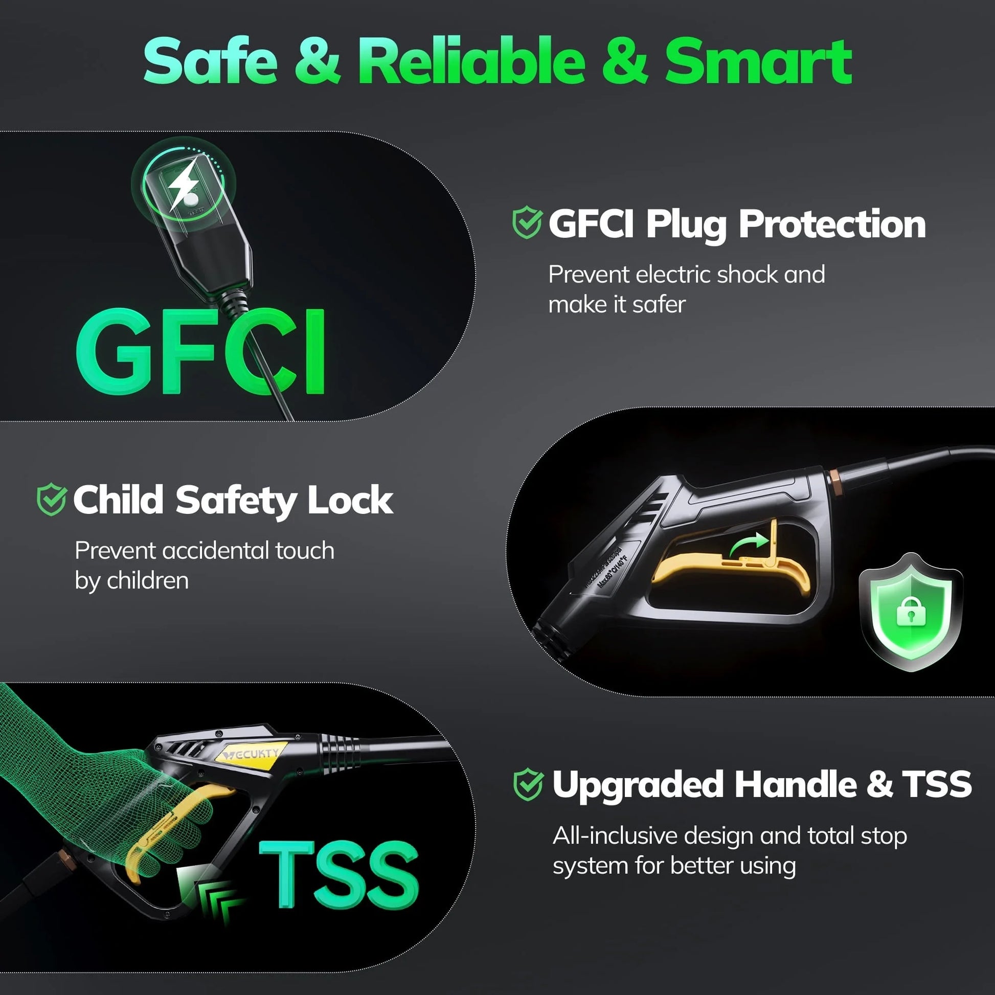 【Smart Energy Saver】: Our high-pressure washer features a Total Stop System, automatically shutting down the electric power when the trigger is released. It restarts with a simple press, conserving energy and extending the motor's lifespan. Efficiency meets performance!
