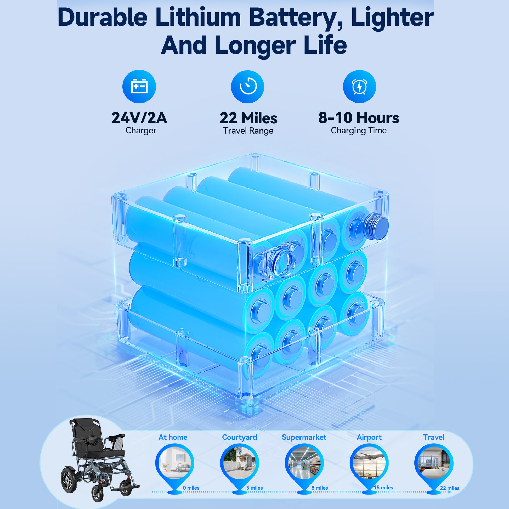 - The wheelchair is equipped with a featherweight lithium battery for extended use.