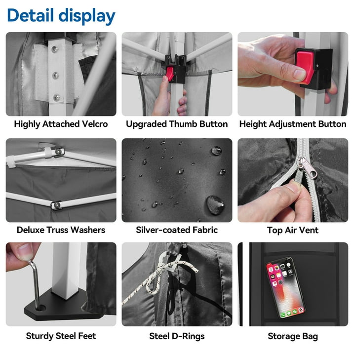 - 【Sturdy&Durable】The roof of the commercial canopy is made of 210D Oxford fabric with PU coating. With UV protection and waterproof function. The upgraded canopy is made of powder-coated aluminum and steel frames to enhance stability and corrosion resistance and provide long-term use. Multiple sturdy roof struts and 4 fixable steel feet provide good support for the instant shelter canopy tent. Waterproof pressure can reach 1000pa and UPF 50 +. Perfect for sunny and rainy times.