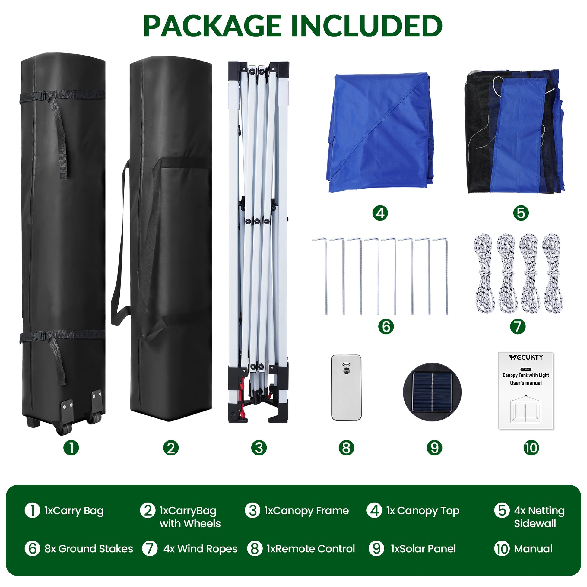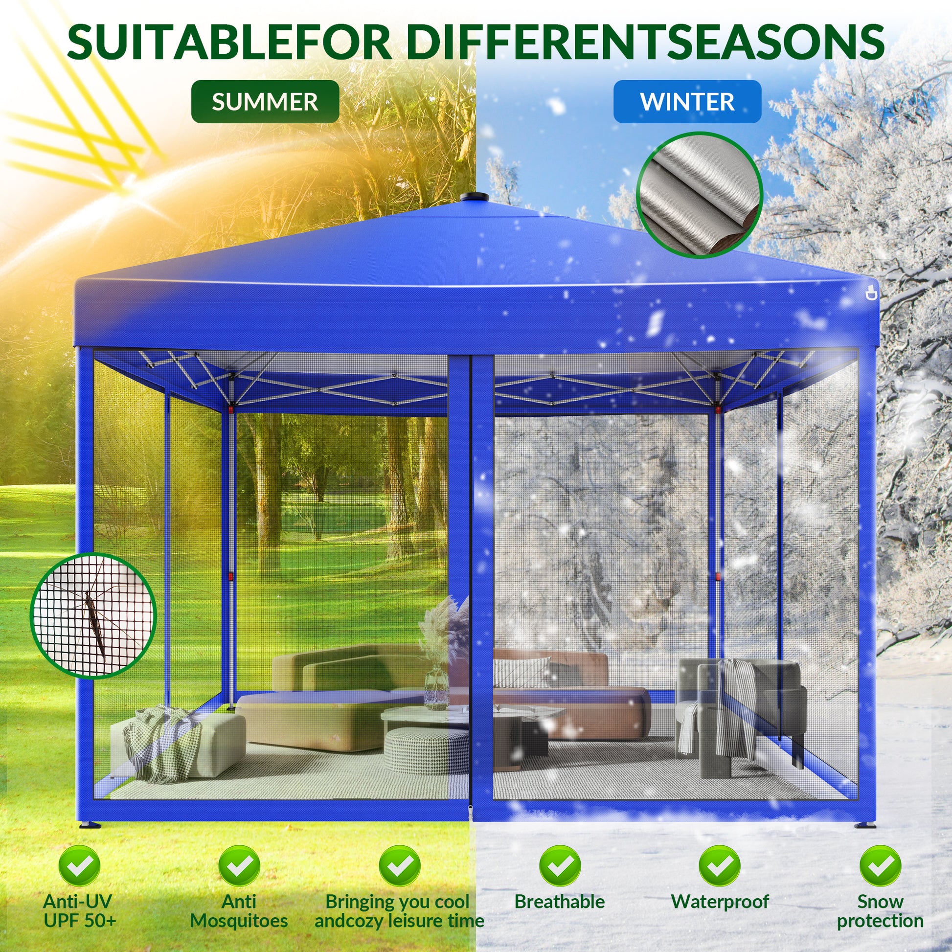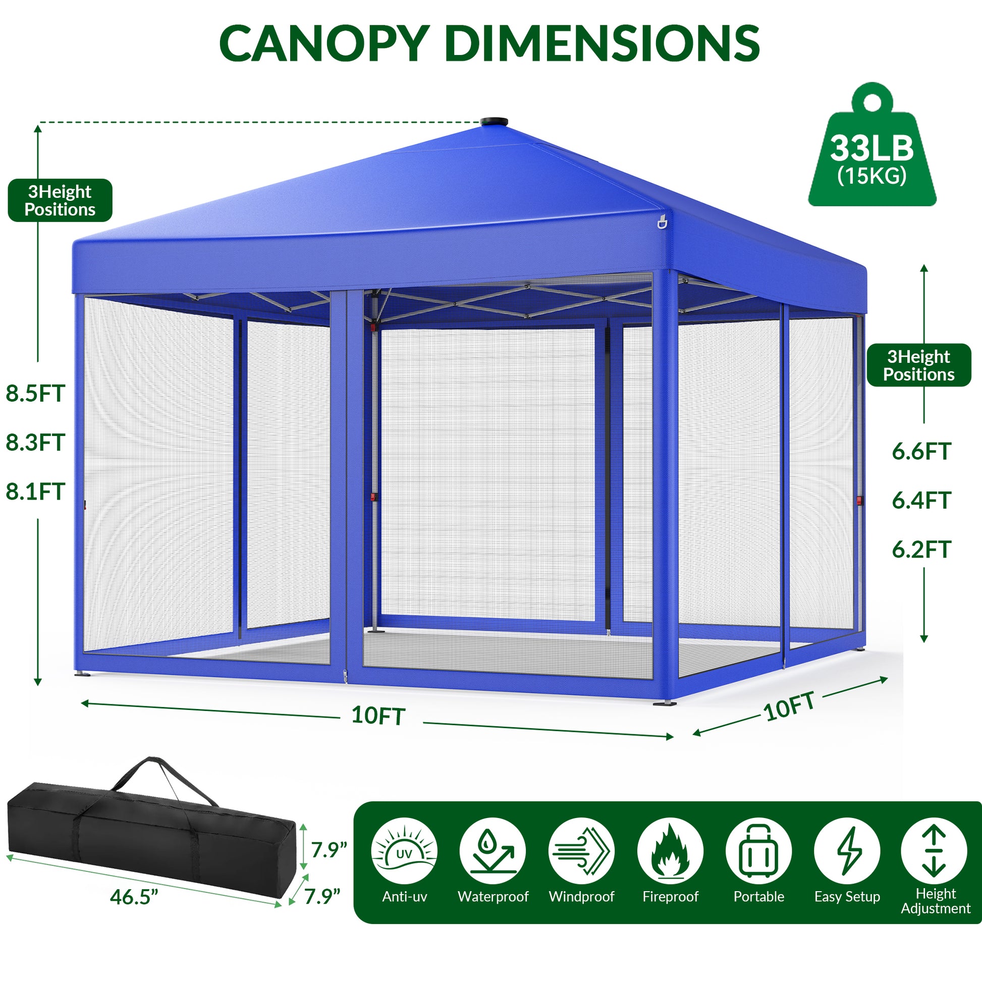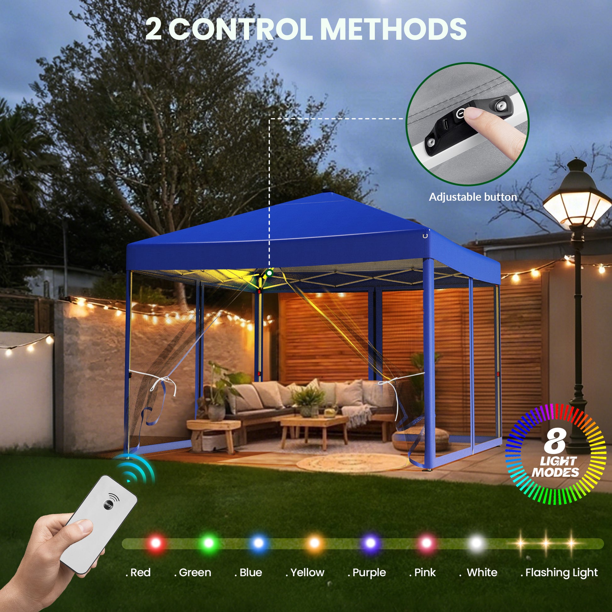 Vecukty 10x10ft Pop Up Canopy Tent with Removable Mesh Mosquito Sidewalls, Remote-Controlled 8-Color LED Lights ,Instant Outdoor Shelter Gazebo Tent,Blue