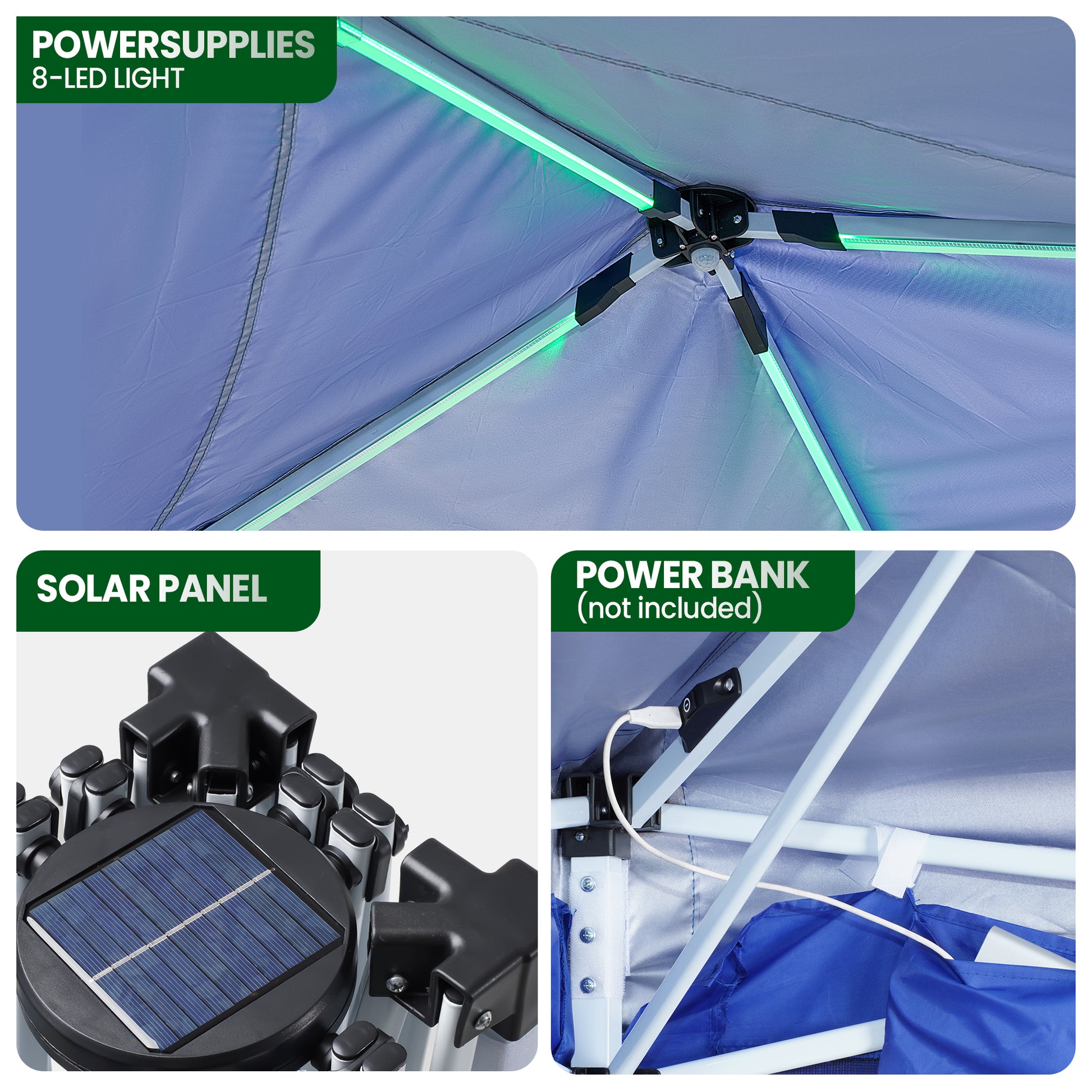 The Vecukty 10'x10' Pop-Up Canopy—a versatile outdoor essential blending comfort and innovation. Featuring 8-color LED mood lighting , this canopy transforms nights with vibrant ambiance controlled remotely or via manual buttons. Solar/USB-C dual charging ensures lights stay powered for up to 12 hours. Enjoy bug-free airflow through detachable mesh walls, effortless 2-A4 person setup, and all-weather UPF 50+/waterproof protection. Compact and portable with a wheeled carry bag, it’s perfect for camping,parties, or garden