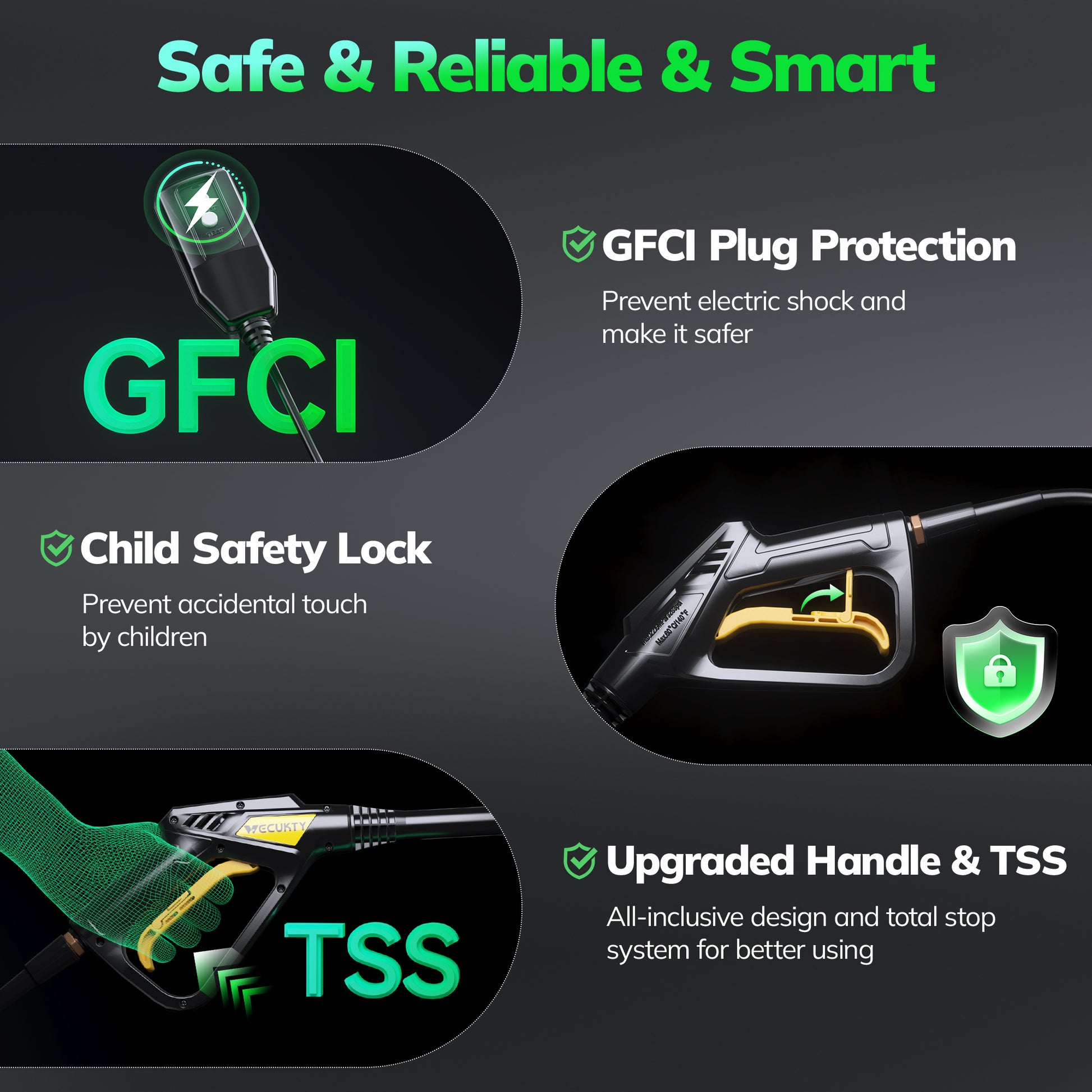 ✅ Smart Energy Savings: Built-in TSS (Total Stop System) automatically shuts off the pump when the trigger is not engaged to save energy and prolong the service time of the electric power washer. A press-type security lock prevents the spray gun from being engaged accidentally.What's more important! Our plug features built-in leakage protection to significantly reduce risks