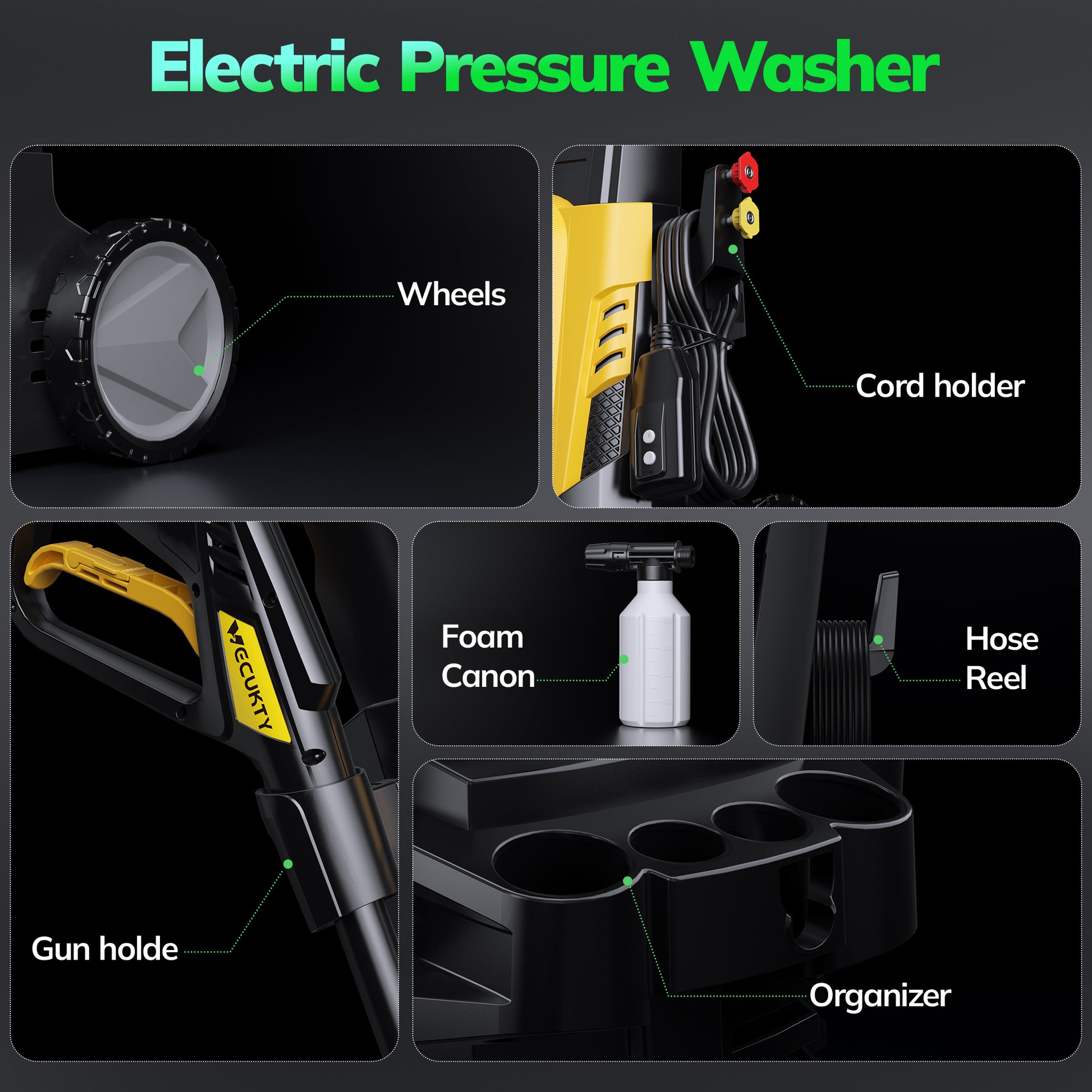 Unleash the power of VECUKTY's electric pressure washer – designed to conquer stubborn grime with a 35FT power cord and 20FT hose for unbeatable range. Effortlessly switch between 4 spray nozzles (0°-40°) to blast driveways, gently wash cars, or tackle any cleaning challenge. Its built-in foam cannon cloaks surfaces in thick suds for deep cleaning, while the smart TSS system saves energy and prevents accidents. Quick to assemble, built to last, and backed by a 1-year warranty – your shortcut to cleaner, faster.Sparkling results start here! Unleash the power of VECUKTY's electric pressure washer – designed to conquer stubborn grime with a 35FT power cord and 20FT hose for unbeatable range. Effortlessly switch between 4 spray nozzles (0°-40°) to blast driveways, gently wash cars, or tackle any cleaning challenge. Its built-in foam cannon cloaks surfaces in thick suds for deep cleaning, while the smart TSS system saves energy and prevents accidents. Quick to assemble, built to last, and backed by a 1-year warranty – your shortcut to cleaner, faster.