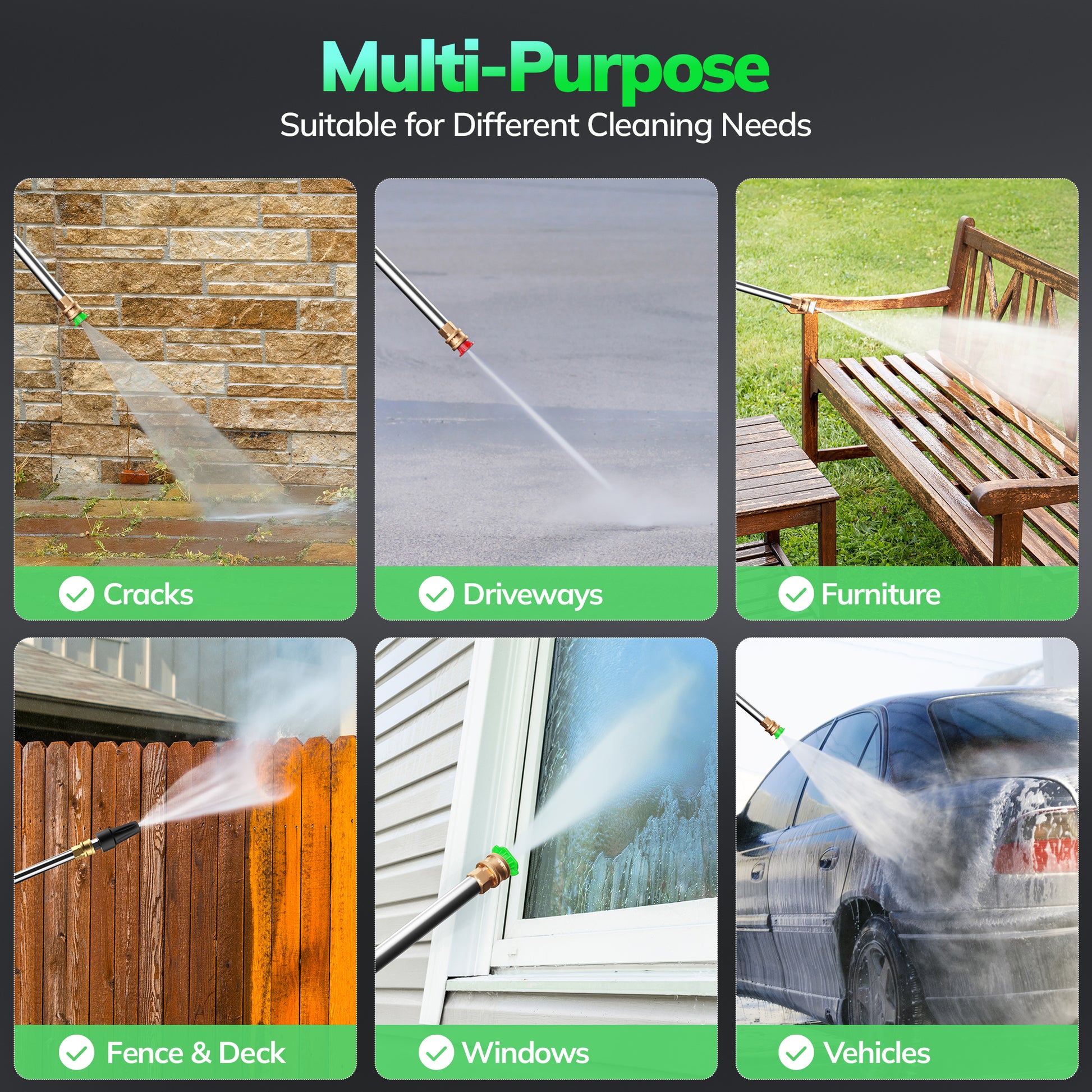 ✅ Versatile Cleaning: Our pressure washer comes with 4 interchangeable spray nozzles (0°, 15°, 25°, 40°) to suit different cleaning tasks. Use the 0°nozzle for intense spot cleaning, 15°for tough surfaces like driveways, 25°for general use, and 40°for delicate surfaces like windows or vehicles. Switch nozzles in seconds with the quick-connect system.