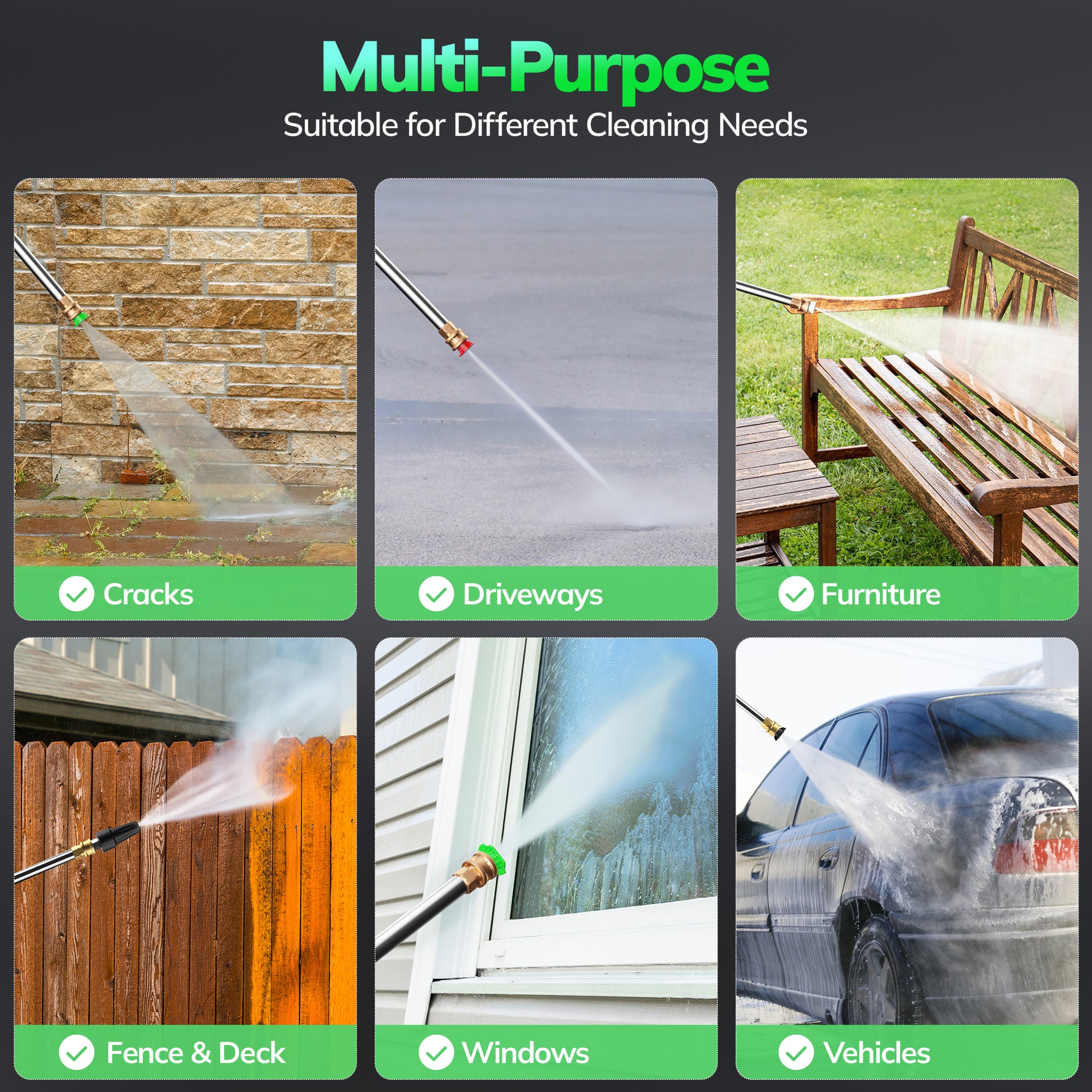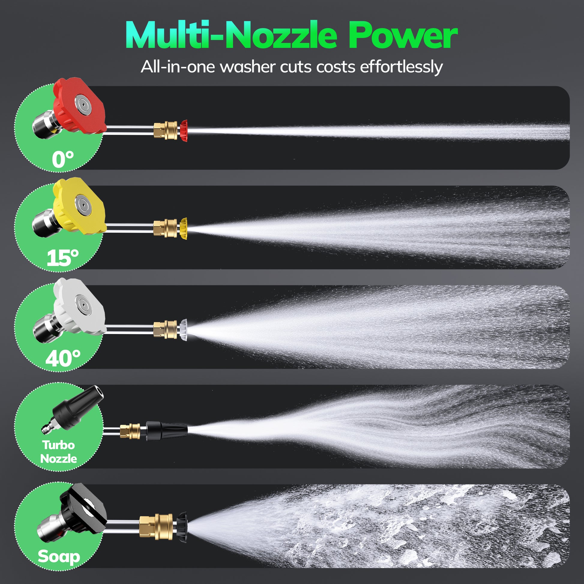 ✅ Versatile Nozzles & Soap Cannon: Tackle any cleaning job with confidence using our electric power washer, equipped with 4 quick-connect nozzles and a powerful soap cannon. Whether you need a gentle spray for delicate surfaces or a concentrated jet for stubborn grime, you’ll always have the right tool for the job, Switch nozzles in seconds with the quick-connect system.