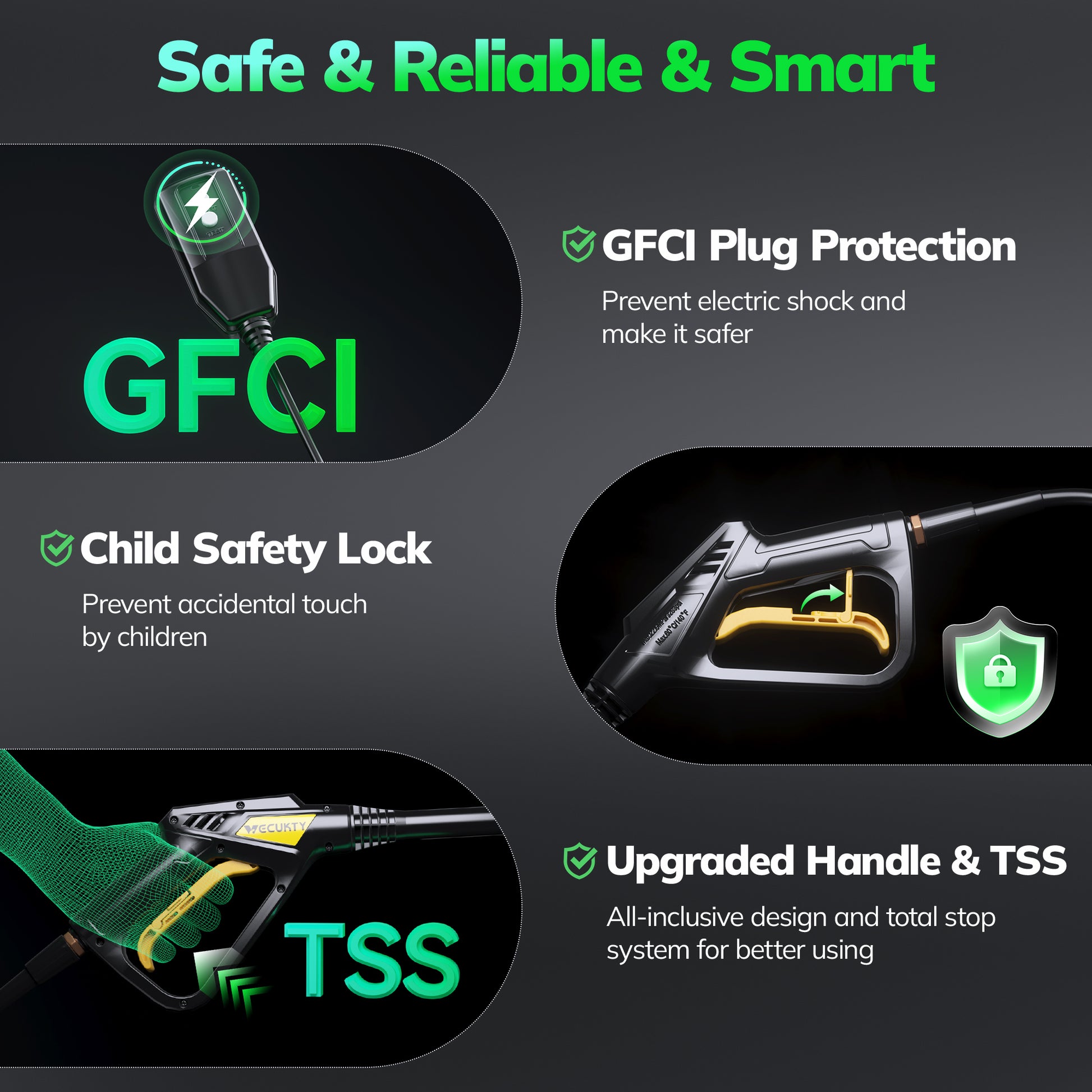 ✅ Smart Energy Savings: Built-in TSS (Total Stop System) automatically shuts off the pump when the trigger is not engaged to save energy and prolong the service time of the electric power washer. A press-type security lock prevents the spray gun from being engaged accidentally. What's more important! Our plug features built-in leakage protection to significantly reduce risks